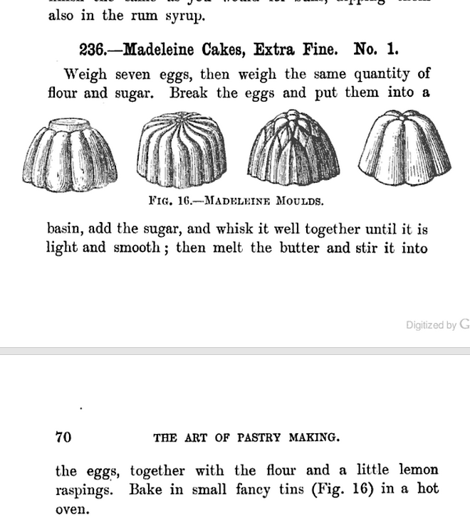 The same ingredients are treated a little differently in wonderful 1893 The Art of Pastry Making: According to the English and French Methods by Emile Herisse. I think you’ll find it a worthwhile book to download. His recipes are unusually approachable. Herisse’s Recipe for Madeleine cakes, extra fine, number 236, is identical to the Larousse recipe except for one detail. Herisse asks that you beat up the eggs and sugar before adding the butter and flour. I like this approach because it reduces the time stirring the flour and thus potentially developing the gluten. Mix the eggs and sugar, but only just. Do not whip into the more standard pale ribbon.