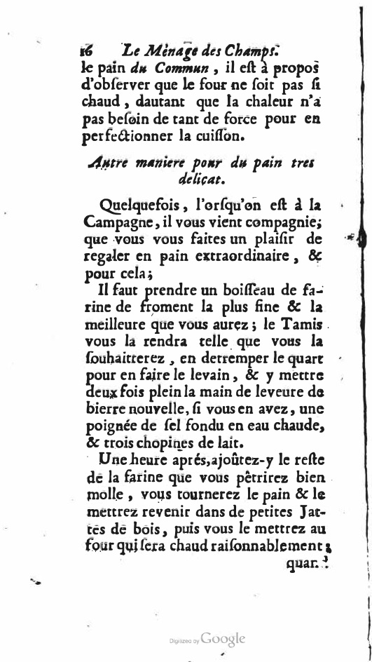 You must take a boisseau* of the best and finest wheat flour you have; use the sieve you prefer, combine water and starter to a quarter of it to make a levain*, and add two full handfuls of new beer yeast, if you have it, a handful* of salt dissolved in hot water*, and three chopines* of milk*.