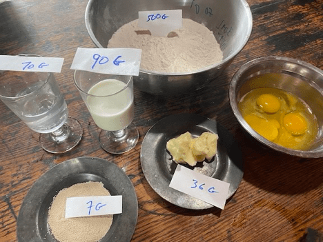 Note on this redaction. For most of the ingredients Howard is big on the term “little.” He calls for a “little” barm, milk, and butter. This said, Howard is precise where we need him to be — the flour and the eggs — and leaves the rest up to his period readers with whom he had a shared understanding that this bread was made with a relatively soft dough — at least compared to the manchet. My redaction is for a 73% hydration. That puts into the low end of what we use today in our modern, unenriched “French bread.”