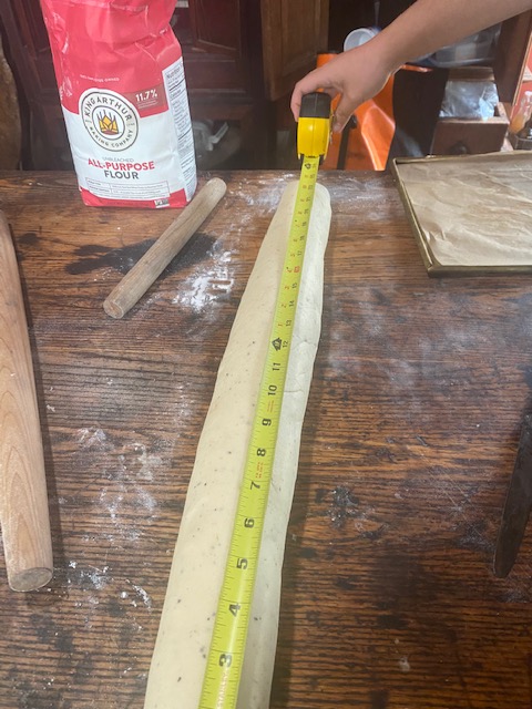 2. The dough is rolled thinly. The instruction to be sure to develop the gluten in the first mixing through long kneading is an absolute requirement. I suggest keeping the work surface where you are rolling the dough lightly floured, and I would also lightly flour the top of the sheet — the part facing you. A little dusting of flour that you rub over the surface keeps the rolling pin moving. A little flour on the counter also lets the dough stretch without resistance. You may need to flip the dough as you roll. If you are not experienced flipping thin soft doughs don’t worry! Assuming the gluten is well developed you just lift the dough with one or two hands, depending how bit it has become, and flips in the time is takes to say, “flip.”