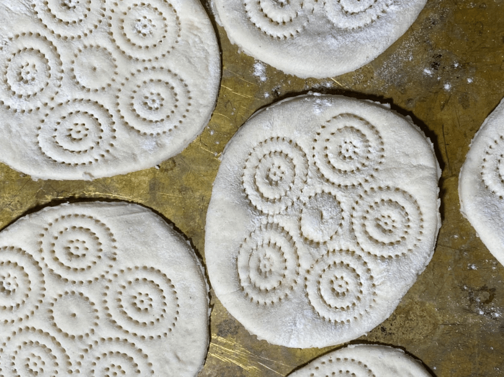 I made this cracker with an Uzbek bread stamp. Etsy is where I buy stamps of this kind. They are used to keep flat breads from fully rising. If you don’t prick flatbreads prior to baking, then they will puff up into a ball — desirable in chapati and pita — not desirable for other bread styles. A fork serves the same purpose, but the Uzbek stamps make far lovelier patterns. Crackers are easily made out of yeasted dough as long as the dough is stiff enough to be rollable. In other words — ciabatta dough with its hydration of 80% to 100%+ does not make cracker dough! Roll appropriately stiff doughs thinly. Cut out rounds with a glass. I dip the glass rim in flour each time I use it to cut the dough to discourage dough from sticking to the rim of the glass. I also dip the Uzbek stamp in flour before each use. If dough is sticking to the Uzbek stamp, then that is the sign that your dough is too soft. I find that crackers work best when baked at a very low temperature, as low as 225°F or 107°F, for a very long time.