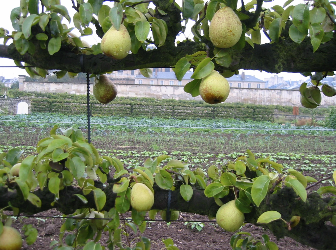 At its height, the 25-acre walled kitchen garden associated with the Palace of Versailles in Versailles, France was one of the world’s largest kitchen gardens. The garden footprint is still intact, with a significant portion of it still being worked. Note the brilliant idea of planting espalier fruit trees to mark the edges of areas planted with vegetables. If you have a kitchen garden plot that is 20 square feet (6.25m) and you plant trees on 6 foot (2m) centers, you can plant roughly 14 trees in that border. I was inspired by the Potager du Roi to plant espalier apples in front of my house to create my front fence. Fourteen espalier fruit trees produce a lot of fruit! And, basically, it takes up no space in your garden.