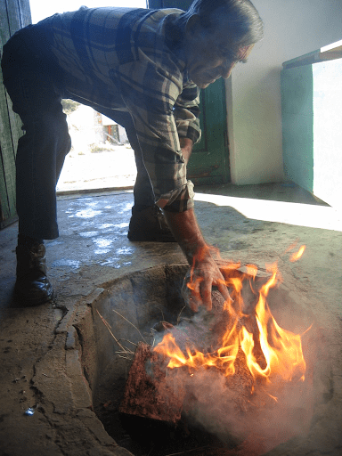 This is a photograph of one of my friends’ friends starting to show me how to make pecorino, a hard, dry, sheep’s milk cheese. Since the 1970s, his family had been heating the milk in a copper pot over a propane stove. But, in my honor, the plan was to demonstrate over live fire. The younger brother, who had arrived to meet me first, tried to light the fire, but he did not know how! He produced smoke, but no fire. As the guest, it was not my place to point out that green wood will not burn. The elder brother, who you see here, eventually arrived, took one look, and took over. I thought it was interesting that the fire-making skill had been so easily lost. It is common, of course, to meet women who don’t know how to light a live fire. Much less common in men, especially those who live in rural and semi-rural communities, which is where these pecorino-makers lived.