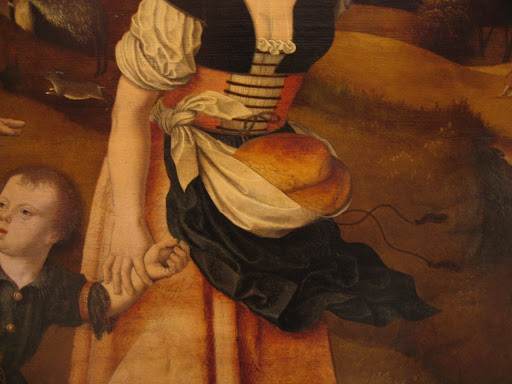 Besides being pretty certain this detail is from a painting in Madrid, I have no idea what painting it is. If any of you recognize it, please make a note in the comments! Thank you! This detail caught my eye today because I love the woman with the child in tow freeing up her hands by holding the bread in an improvised waist band. A gesture from the past. I also read the bread as being a basic white.