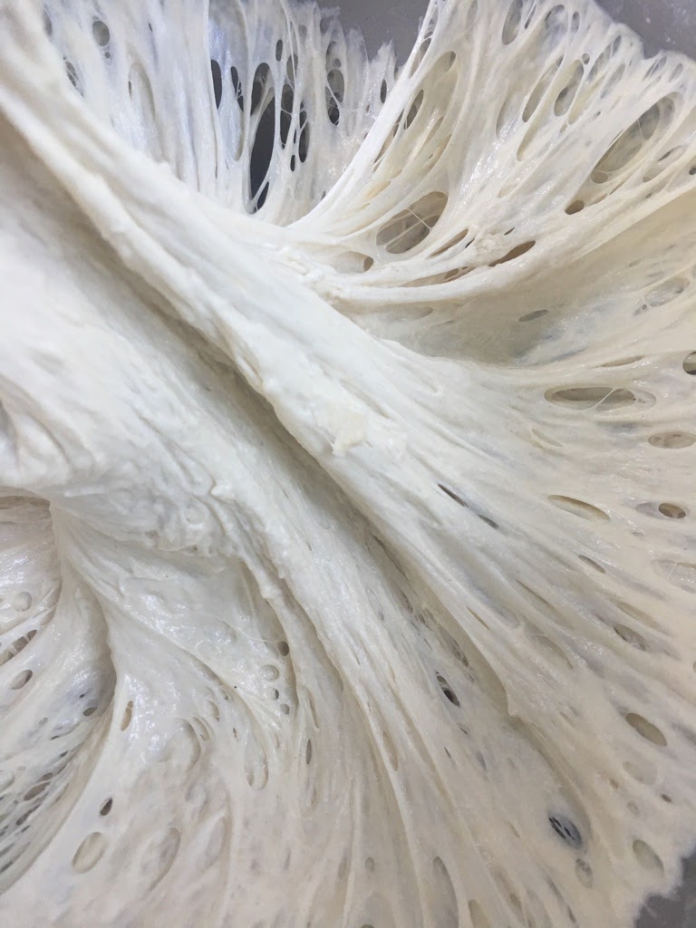 Gluten! Gluten, the protein structure in wheat flour that makes it possible for a pizzaiolo to toss pizza dough into the air in order to stretch it; the fine balloon-like network of bubbles that makes white wheat bread the bread with the biggest potential air bubbles baked into a finished loaf. Gluten can be developed by working the dough, like by kneading it. But gluten can also be developed by letting dough rest for a long time, like overnight. My standard bread is 100% flour, 75% water, 1.5% salt, .25% yeast. Mix with water the night before, cover, and leave out all night. In the morning, if you reach into the bowel, and lift up, as I have here, you will see the gluten threads, as one does in this photograph.