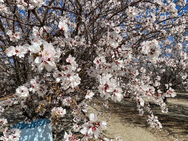 More fruit trees in bloom along California Interstate 5 that runs up the state’s Central Valley. On one side of the valley is the Pacific Range — the low mountains that hug the Pacific Ocean from Mexico up into Canada — and on the other, the Sierra Nevada, rising beyond 4,000 meters and marking the easternmost boundary of California’s eastern border.