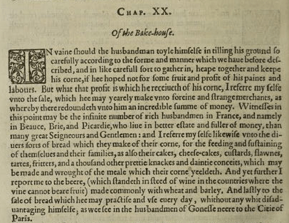 Chapter XX is the chapter that focuses on bread. It was was not in the first edition. The bake house chapter is in the 1598 French edition that is the basis for the 1600 English edition translated by Richard Surflet. This 1616 English edition is based on the Surflet edition. It was revised and expanded by Gervase Markham, a prolific agricultural writer and literary figure in the first decades of the 17th century.