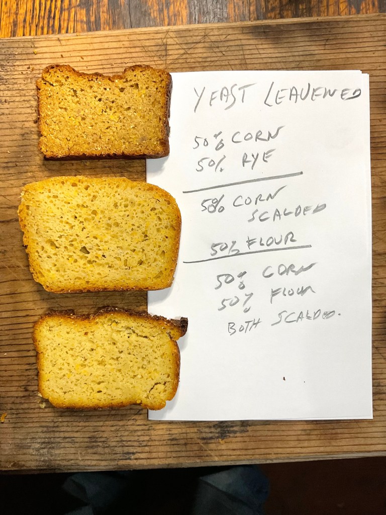 The top bread is made with half cornmeal and half rye mixed with scalding hot milk. The second bread is made with cornmeal and wheat flour, but only the cornmeal is gelatinized, and the bottom bread is the same mix, but both flours are mixed together, as the corn and rye was in the top bread and mixed with water just off the boil. Clearly, it does not have as open a crumb. On the other hand, it is noticeably sweater in taste — more glucose was released in the gelatinizing process — and the dough is moister.