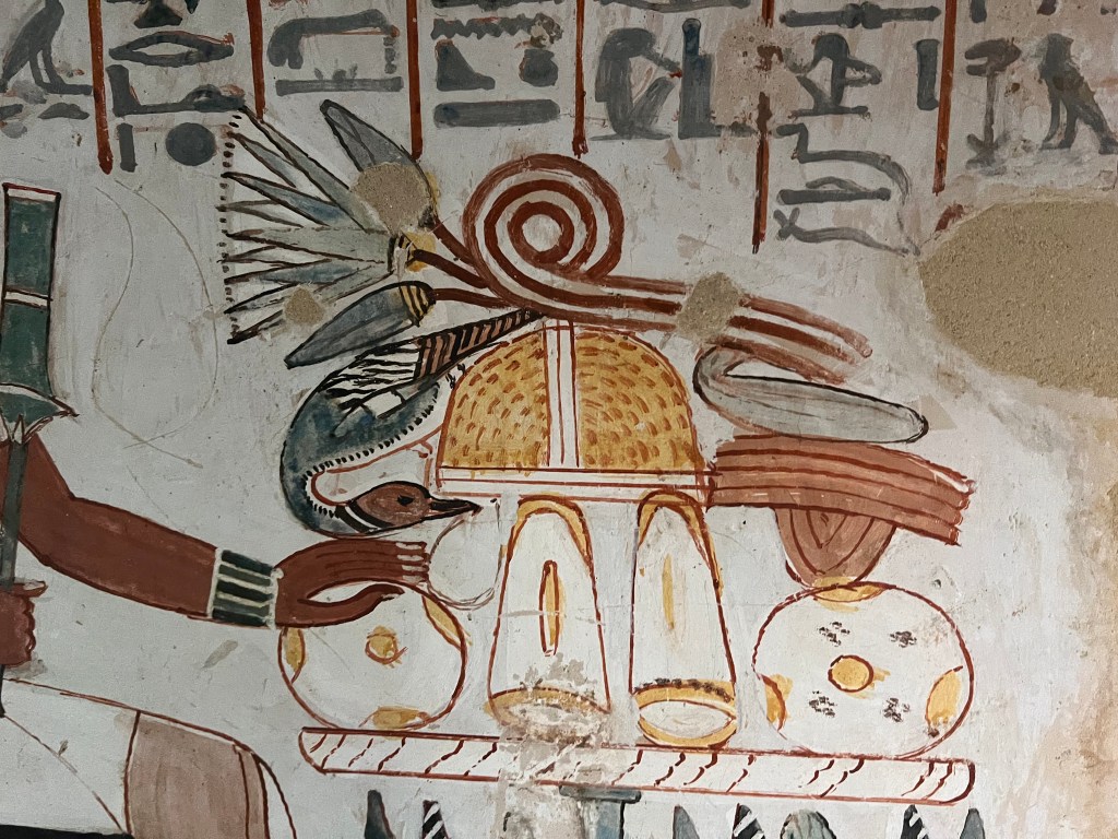 This painting, in tomb TT69, may offer us a way to understand the perspective the artist used in depicting breads on offering tables. What you see here is a common concept in tomb and temple art. The depiction of foodstuffs, often with bread on the bottom layer, displayed on an offering table. The offering tables were made of stone.