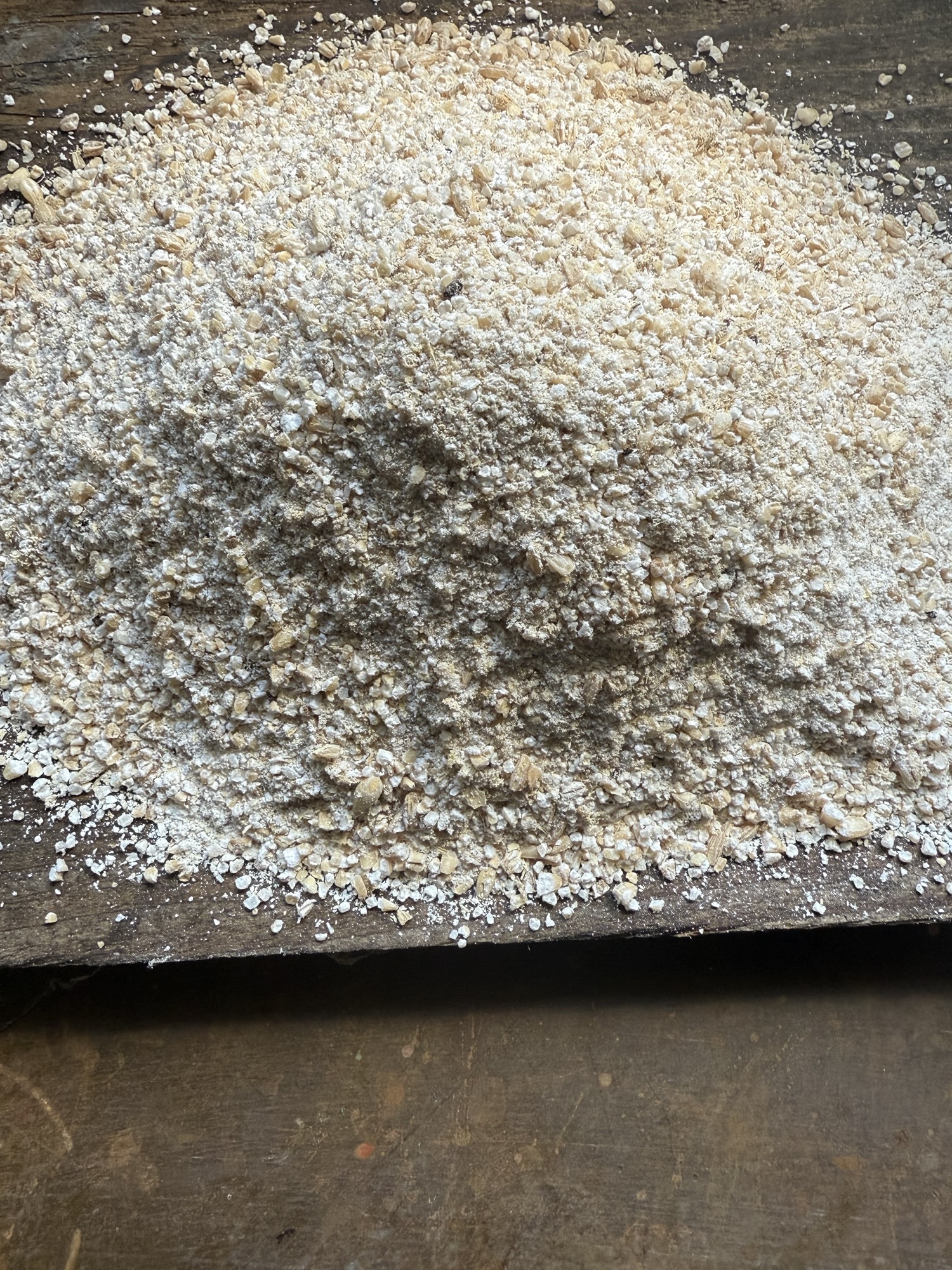 Flour. The excavated bread is an unknown mix of emmer and common bread wheat. This bread is much whiter than the barley bread. 43% of the particles are less than 300 µm. This is effectively white flour. If you don’t have a flour mill, then use white flour for this 43% fraction, and mill the rest in spinning blade coffee mill. Semolina ranging from 300 µm to 1000 µm is 24%, and grist larger than 1000 µm 15%.