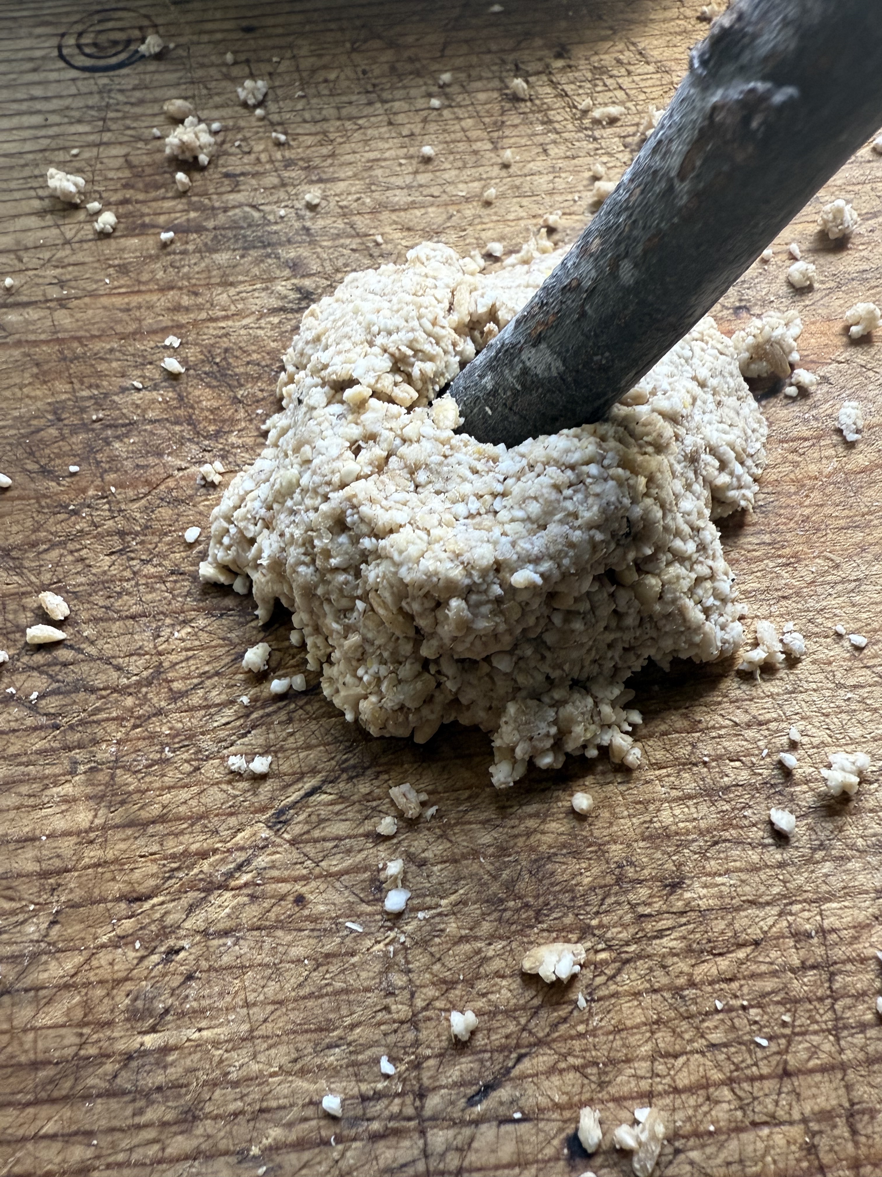 Forming the bread: The dimensions of the find are 60 mm in diameter and 20 mm high. Weigh out a 60g piece of dough and then crudely form around a stick. As one sees from the photo, do not be too careful. Not a perfect circle. The center point is not in the center.